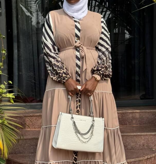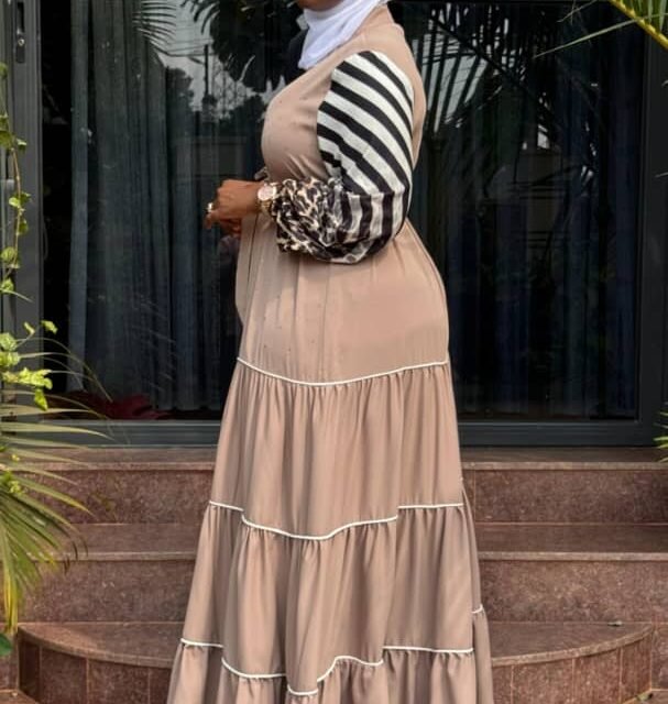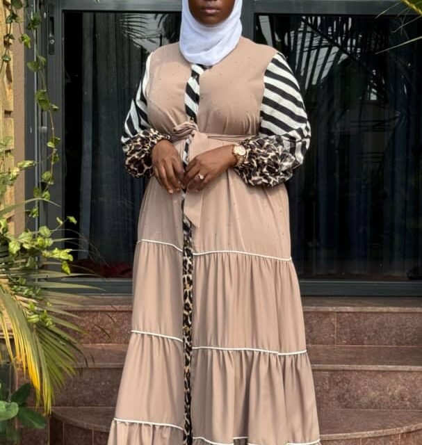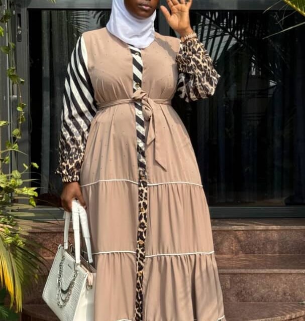 The outfit consists of a long, flowing abaya-style dress in a light brown or beige color, featuring tiered ruffles on the skirt and a matching fabric belt tied around the waist. The dress has a distinctive design with contrasting patterns on the sleeves and a central panel running down the front. One sleeve features black and white stripes, while the other sleeve and the central panel are adorned with a leopard print.