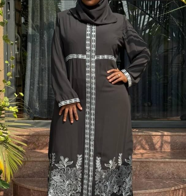 Hijab: A black headscarf covers the head and neck, complementing the abaya.