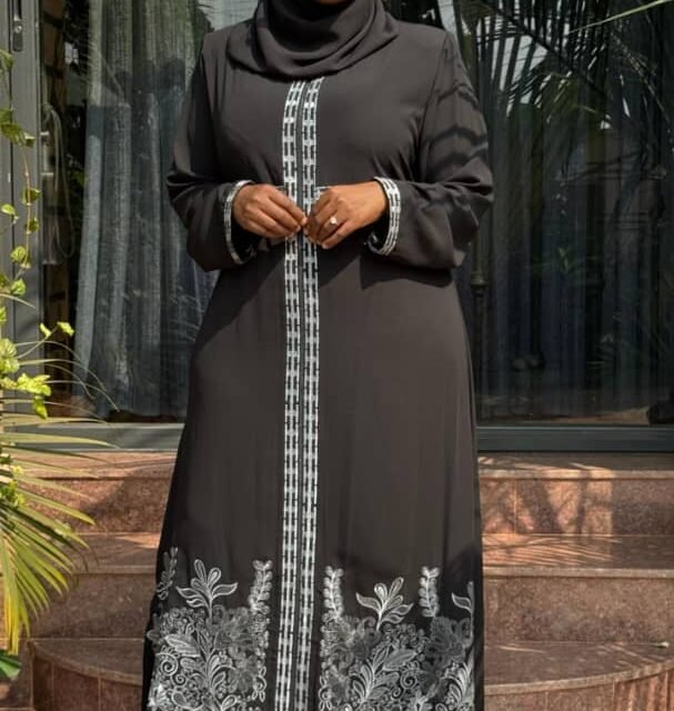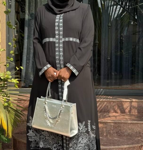 Abaya: This is a long, loose-fitting, black outer garment covering the entire body except for the head, hands, and feet. It features elaborate silver and white embroidery along the central front opening, extending down to the hem, and also on the lower part of the sleeves and the bottom hem of the garment.
