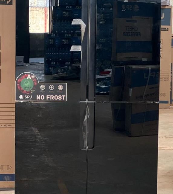 The SPJ side-by-side refrigerator offers a blend of style and efficiency, with a large storage capacity suitable for modern homes. Its sleek, black mirror glass finish and two-door design provide a sophisticated look, while its advanced technology ensures optimal food preservation. The appliance features an A+ energy rating and a powerful, low-noise compressor, designed to save on electricity bills.