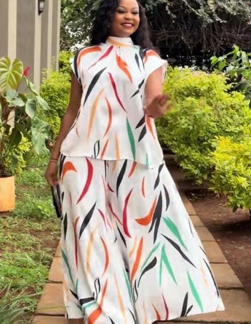 - Wide-leg trousers, also featuring the same abstract, colorful print on a black base.