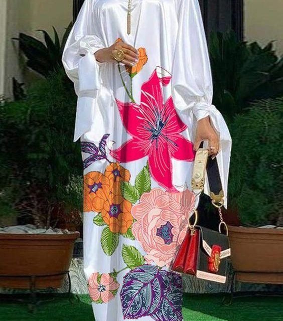 Features long sleeves, vibrant floral prints, and a flowing, maxi-length silhouette.